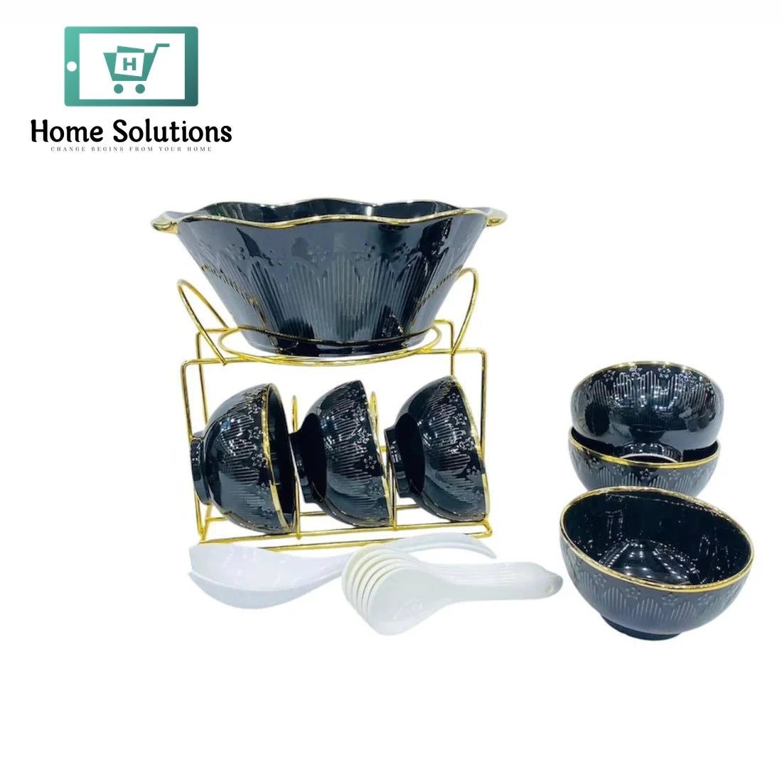 Premium 16-Piece Ceramic Soup Set with Wooden Stand – Black & Gold