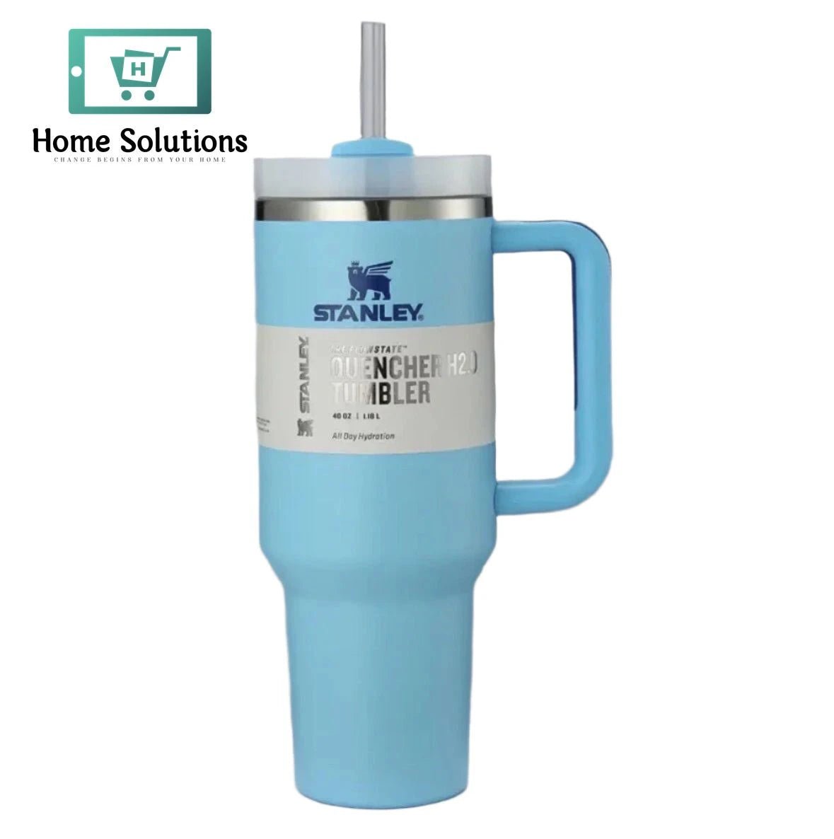 Blue Stanley mug with handle and straw