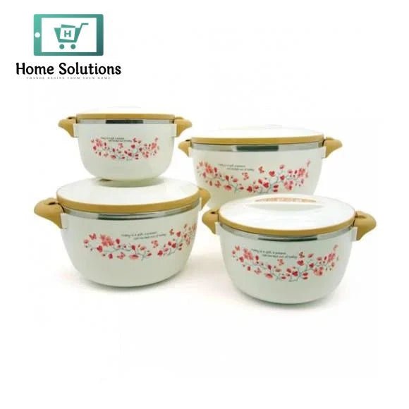 Serve your meals in style with this 4-piece Thailand Insulated Hot Pot Set in elegant floral white. Each pot features a thermal insulated interior that keeps food warm for hours. Made with durable plastic and a stainless steel lining, these pots come with secure lids and easy-grip side handles for effortless use. Ideal for family dinners, gatherings, and everyday serving needs.