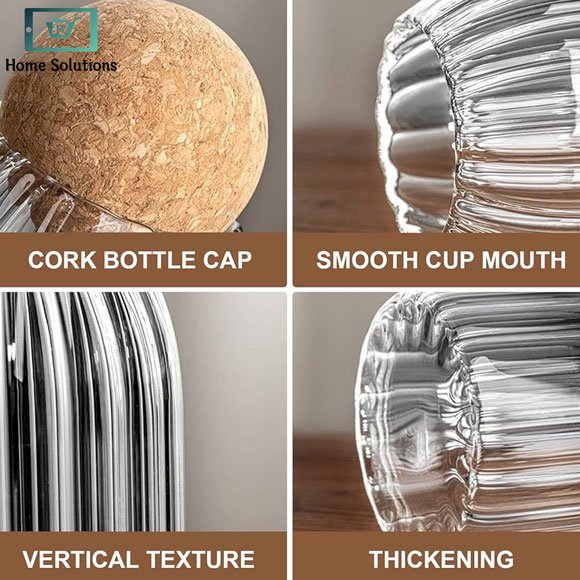 The vertical textured design provides a stylish look while ensuring a comfortable grip. Its airtight cork lid prevents moisture and air from entering, preserving the quality of your ingredients. The clear glass body allows you to see the contents at a glance, making it practical and convenient for everyday use.