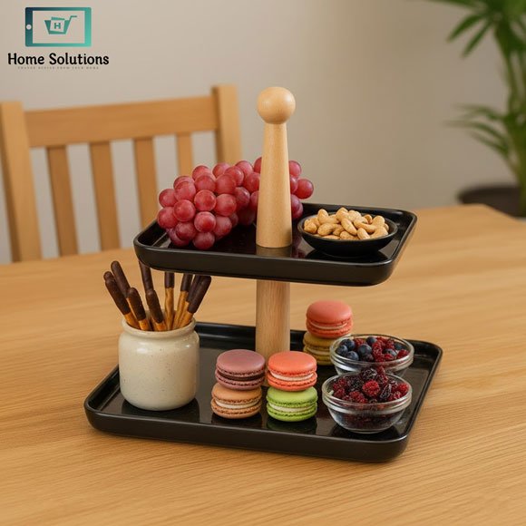 Two-Tier Black Serving Tray with Wooden Stand – Elegant Dessert & Snack Display