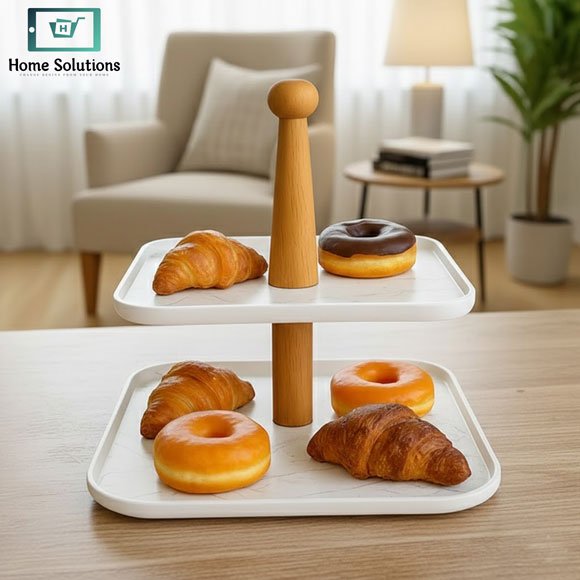 Two-Tier White Serving Tray with Wooden Stand – Elegant Dessert & Snack Display