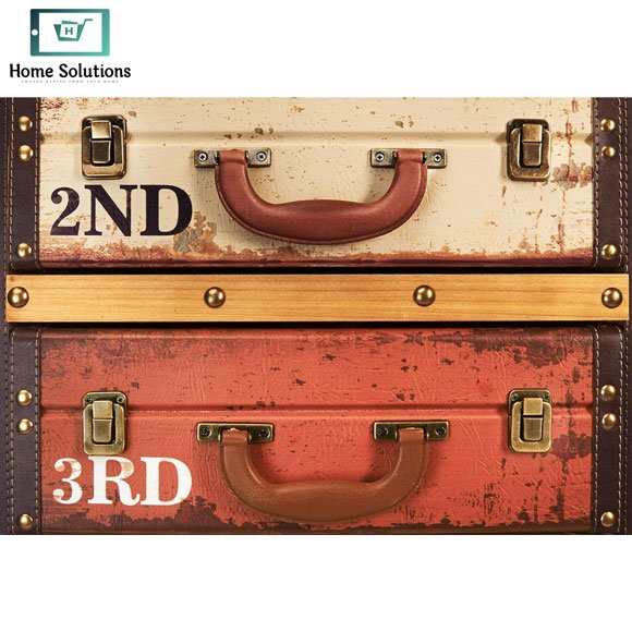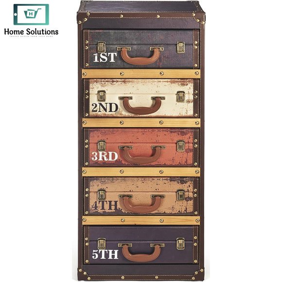Each drawer is crafted like a mini suitcase, complete with leather-style handles, buckle locks, and numbered design (1st to 5th), giving it an authentic vintage travel vibe. The multi-color distressed finish enhances its rustic appeal, making it a perfect statement piece for any room.