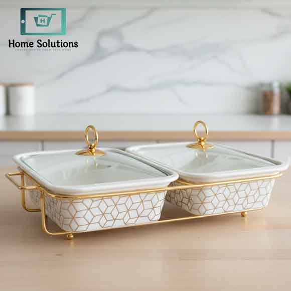 Add elegance and convenience to your dining experience with this White Twin Chafing Dish, crafted with high-quality ceramic bowls and a luxurious gold metal stand. Designed for both formal and casual gatherings, this double rectangular warmer is perfect for serving two dishes side by side while keeping them warm and beautifully presented.