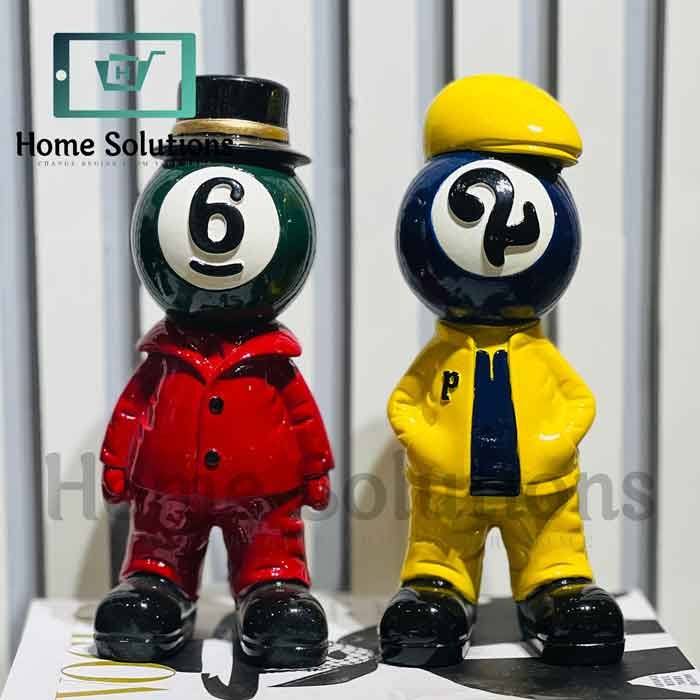 Unique Design: Each figurine features a pool ball head dressed in fun, stylized outfits – one in a dapper red suit with a top hat, and the other in a vibrant yellow raincoat and cap.